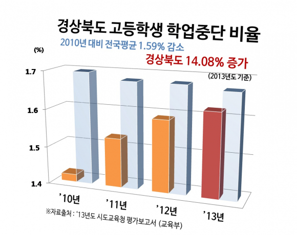 이영직 예비후보 측이 입수한 '13년도 시도교육청 평가보고서에 따르면 '13년도 경북의 고등학생 학업중단비율은 전년도 대비 1.9% 증가한 1,545명으로 나타났다.