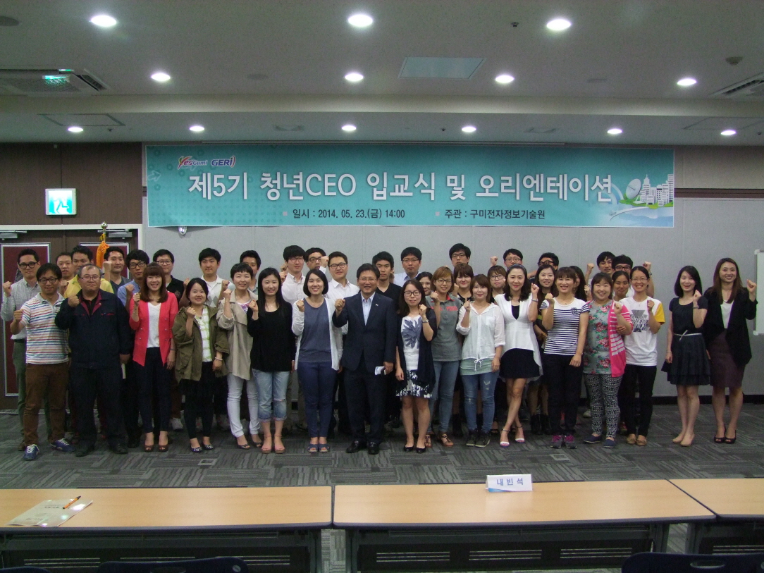 구미전자정보기술원(GERI, 원장 안병화)은 5월 23일 구미코에서 지난 5월 초 선발된 제5기 구미시 청년CEO 입교식 및 오리엔테이션 시간을 가지고 창업을 위한 힘찬 도약의 발걸음을 내딛었다.