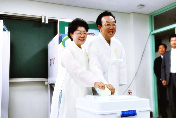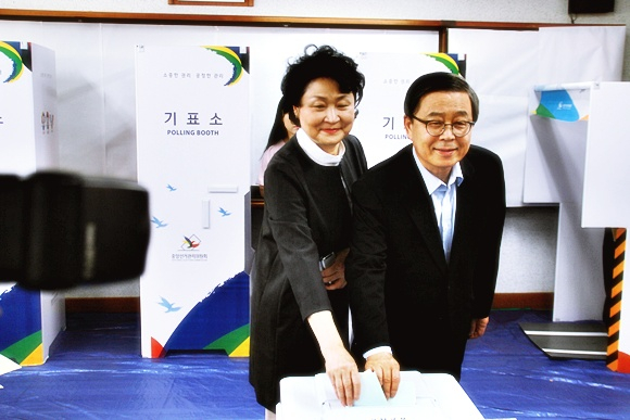 김관용 경북도지사 후보는 오전 일찍 구미시 고아읍 문장초등학교에 마련된 투표소에서 부인과 나란히 투표를 했다.