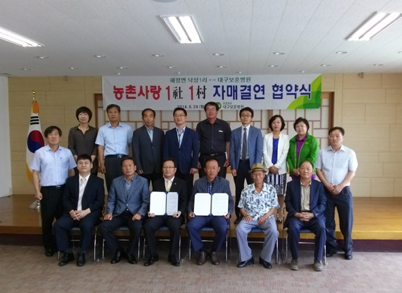 해평면 낙성1리(이장 박창성)와 대구보훈병원(원장 이상흔)은 6월 24일 해평면사무소에서 낙성1리 마을대표 5명과 대구보훈병원 임직원 5명이 참석해 '1사 1촌 자매결연식'을 가졌다.