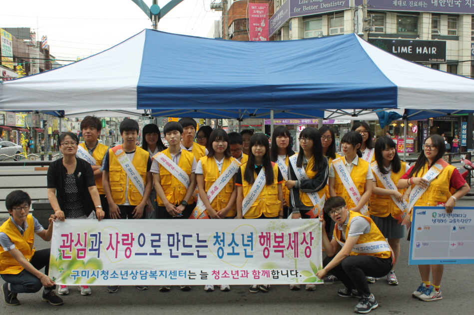 구미시청소년상담복지센터(소장 배정미)는 6월 25일 구미역과 구미문화로 일원에서 청소년상담복지센터 직원 및 청소년참여위원 등 40명이 참여 위기가능 청소년 예방ㆍ발굴을 위한 거리 홍보를 실시했다. 이날 홍보활동은 구미시청소년참여위원들이 주체적으로 참여해 위기가능 청소년 예방ㆍ발굴과 청소년전화 1388, 모바일상담, 사이버상담 등 보다 많은 청소년들이 도움을 받을 수 방법을 알리기 위해서 실시했으며, 캠페인을 마친 후에는 매월 개최되는 청소년참여위원회 6월 정기회를 가졌다.