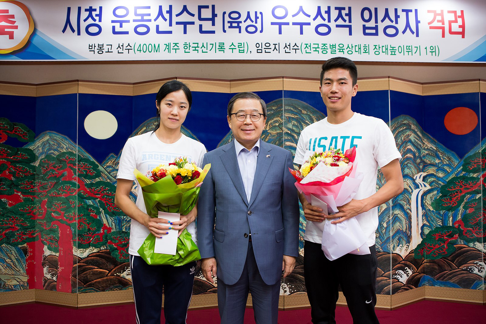 이날, 남유진 구미시장은 두 선수에게 그 동안의 노고에 대해 위로와 격려로 고마움을 표하고, 더욱더 기량을 연마해 다가오는 아시안게임의 선전과 함께 구미 육상을 빛내 줄 것을 당부했다.