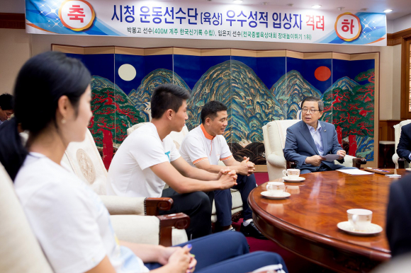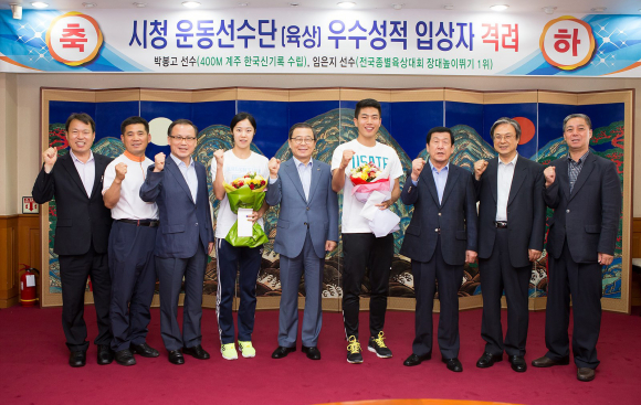 구미시(시장 남유진)는 7월 10일 국제통상협력실에서 시청 육상팀(감독 권순영) 박봉고, 임은지 선수가 최근 개최된 육상대회에서 우수한 성적으로 입상한 것을 축하하며 격려하는 자리를 가졌다.