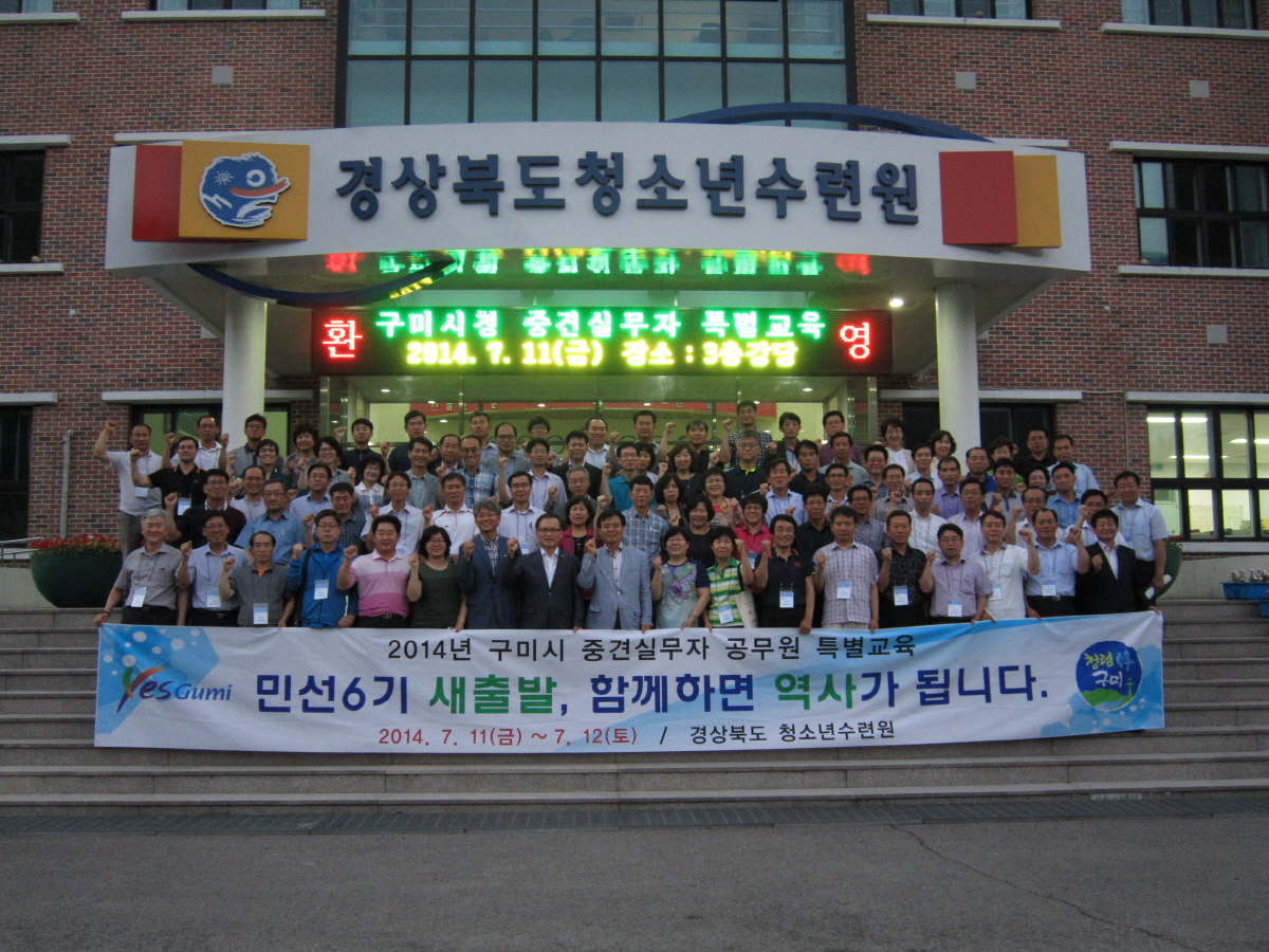 구미시(시장 남유진)는 7월 11일 ~ 7월 12일까지 1박 2일 일정으로 경상북도청소년수련원(김천시 아포읍 소재)에서 6급 중견실무자 공무원 100명을 대상으로 민선6기 새출발, 소통과 화합의 시정을 위한 제1기 구미시 중견실무자 공무원 특별교육을 실시했다.