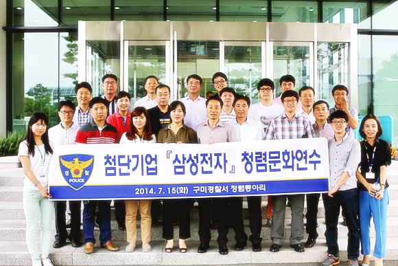 구미경찰서(서장 권오덕) 청렴동아리 초심회는 7월 15일 구미시 임수동 소재 삼성전자를 방문했다. 이번 방문은 홍익 청렴문화 조성을 위해, 일류 최첨단기업인 삼성전자의 청렴시책을 공유하고자 청렴동아리 회원(25명)들이 방문했으며, 그 자리에서 삼성이 세계 일류 최첨단기업으로 성장하는데 바탕이 된 회사 윤리강령 및 청렴시책을 직접 듣고 배웠다.