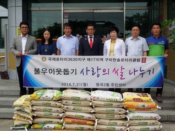 구미한솔로타리클럽(회장 배형원)은 7월 21일 형곡2동주민센터를 방문해 형편이 어려운 30가구를 위해 쌀 30포(20kg 23포, 10kg 7포, 130만원 상당)를 기탁했다.
