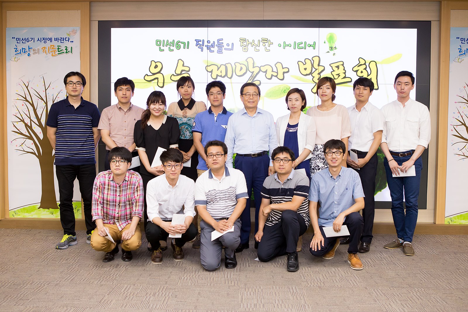 발표회는 아이디어 제안현황 설명, 우수제안자 발표 및 격려, 총평 순으로 진행됐으며, 행사 전에는 민선6기 시정에 바란다는 제목으로 참가직원들이 직접 본인의 지문을 찍고 다양한 바람을 적는 희망의 지문트리 이벤트를 실시하기도 했다.
