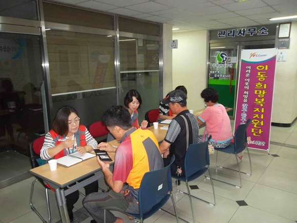 구미시(시장 남유진)는 8월 7일 저녁 6시 ~ 8시까지 황상3주공관리사무소와 선산읍사무소에서 어려운 이웃을 직접 찾아가 안내하고 지원하는 권역별 이동 희망복지지원단을 운영했다.