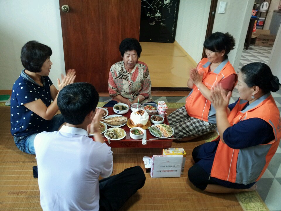 이날, 회원들은 더운 날씨에도 불구하고, 구슬땀을 흘리며 어르신이 좋아하는 음식을 손수 장만하는 등 푸짐한 선물을 마련해 생신을 축하했다.