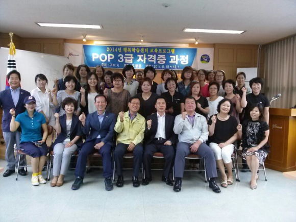 도량동(동장 최현도)은 8월 18일 최윤구 평생교육원장 및 시ㆍ도의원들과 통장협의회장(신정자), 새마을부녀회장(차선희), 새마을작은도서관 분회장(김동숙) 등 주민대표들이 참석한 가운데 POP 3급 자격증 과정 개강과 함께 도량동 행복학습센터 현판식이 열렸다.