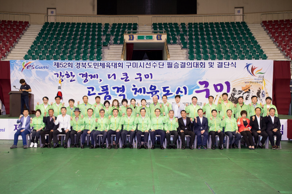 구미시체육회(회장 남유진)는 8월 20일 박정희체육관 주경기장에서 구미체육발전을 위한 체육회의 결속을 다지고 오는 8월 29일 ~ 9월 1일까지 문경시 일원에서 개최되는 제52회 경북도민체전 우승을 다짐하기 위한 필승결의대회 및 결단식을 개최했다.