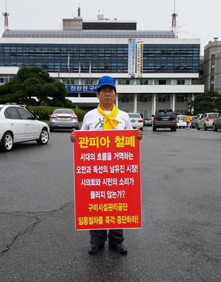 이는 지난 8월 20일부터 구미시청 앞에서 실시한 구미시설공단 임원 공모와 관련, 관피아 철폐를 촉구하는 1인 시위에서 불거졌다.