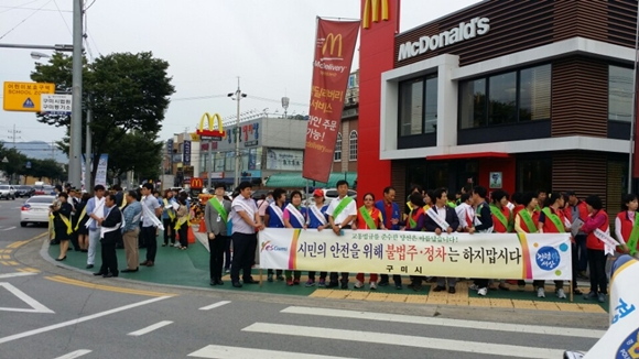 구미시(시장 남유진)는 9월 1일 송정동 KBS앞 네거리에서 '시민이 행복한 민선6기', 선진 교통문화 정착을 위한 첫걸음으로 불법 주ㆍ정차 문제 해결을 위한 시민의 준법의식을 제고하고 자율적 참여운동 전개를 위해 교통법규 기초질서 지키기 캠페인을 전개했다.