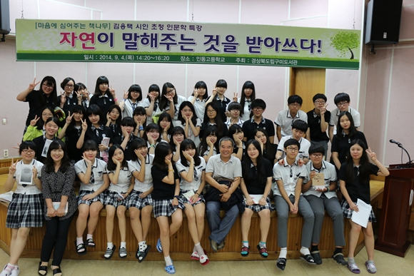 이날 강연은 섬진강 시인으로 알려진 김용택 시인을 초청해 '자연이 말해주는 것을 받아쓰다!'라는 주제로 현일고등학교와 인동고등학교 학생 및 교사 등 270여 명이 참여한 가운데, 강연과 시인과의 대화, 사인회, 기념촬영 등의 행사로 진행됐다.