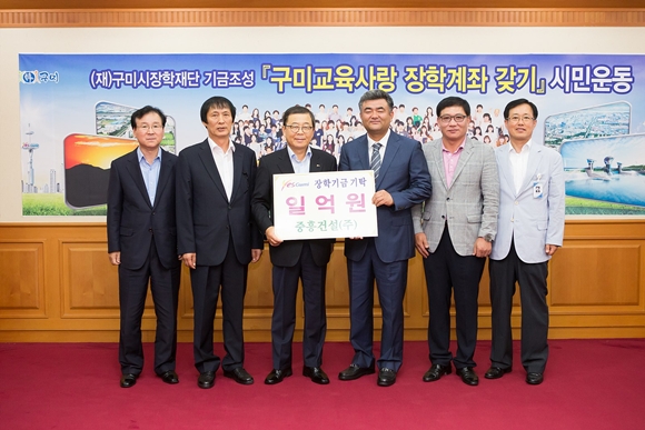 (재)구미시장학재단(이사장 남유진)은 9월 16일 구미시청 1층 국제통상협력실에서 중흥건설(주) 정원주 사장 및 임원들이 참석해 장학기금 1억원을 기탁하는 뜻 깊은 자리를 가졌다.