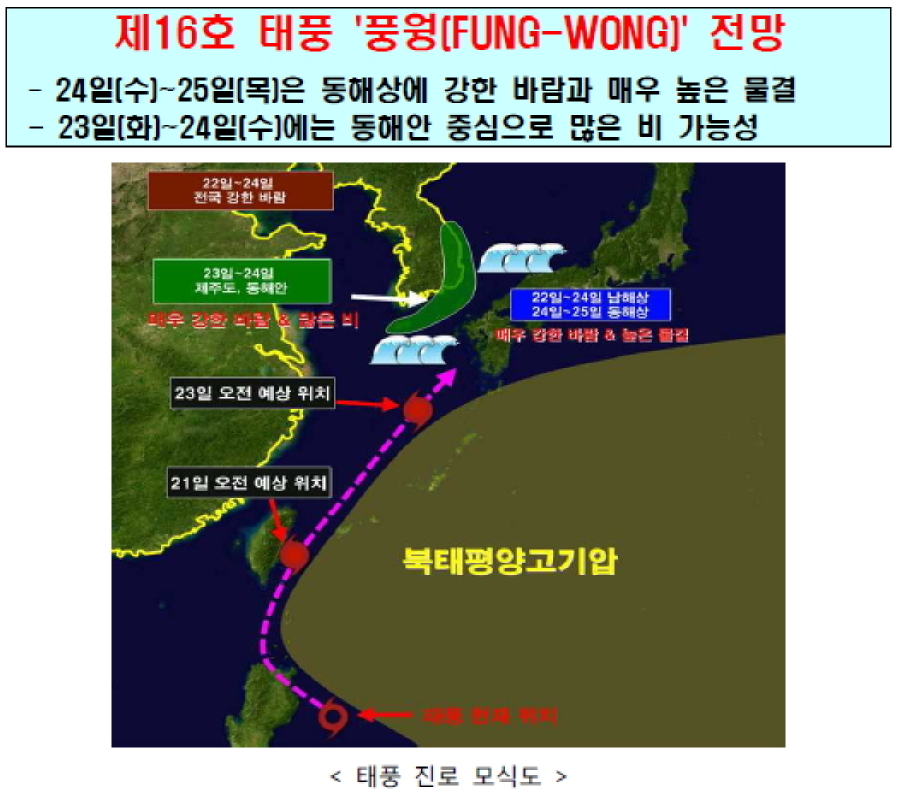 9월 18일 03:00시경 필리핀 마닐라 동남동쪽 약 910km 부근 해상에서 발생한 제16호 태풍 ‘풍웡(FUNG-W9월 18일 03:00시경 필리핀 마닐라 동남동쪽 약 910km 부근 해상에서 ONG)’이 9월 19일 09:00시 현재 강도는 약, 크기는 중형 태풍(중심기압 990hPa, 중심부근 최대풍속 24m/s)으로 발달해 필리핀 마닐라 북북동쪽 약 350km 부근 해상을 지나 북태평양고기압 가장자리를 따라 시속 44km의 속도로 북서진하고 있다.