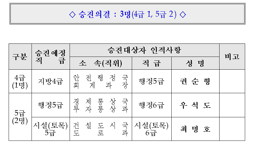 구미시는 9월 22일자로 승진 의결자( 3명)에 대한 명단을 발표했다. |