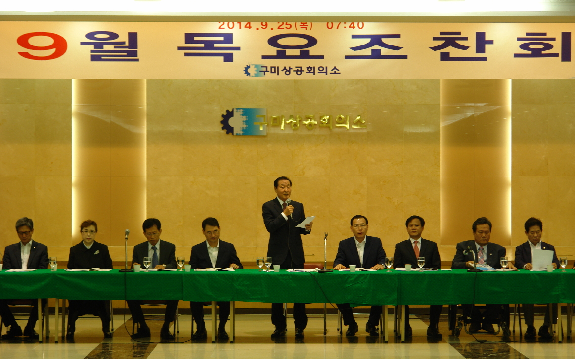 구미상공회의소(회장 김용창)는 9월 25일 상공회의소 2층 대강당에서 김용창 회장, 여상삼 부회장, 김익수 구미시의회 의장, 한덕기 구미세무서장, 이갑수 구미세관장, 김정숙 구미교육장, 이홍희 경상북도의원, 김인배, 김정곤, 안장환, 윤종호 구미시의원을 비롯한 기관단체장, 회원사 대표 및 임직원 등 160여명이 참석한 가운데 9월 목요조찬회를 개최했다.