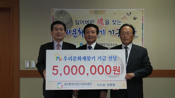 국외로 반출된 우리문화재 반입운동에 힘쓰고 있는 (사)우리문화재찾기운동본부(회장 박영석)는 9월 7일 대구염색산업단지관리공단 정명필 이사장으로부터 우리문화재 환수 기금으로 써달라며 500만원을 기탁받았다.