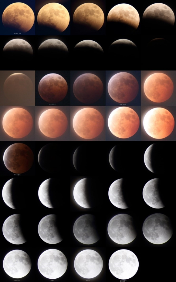 저녁 6시 동쪽하늘에서 달이 뜨자마자 시작된 개기월식은 7시24분경 달이 지구 그림자에 완전히 가려지는 개기월식으로 장관을 연출했다.