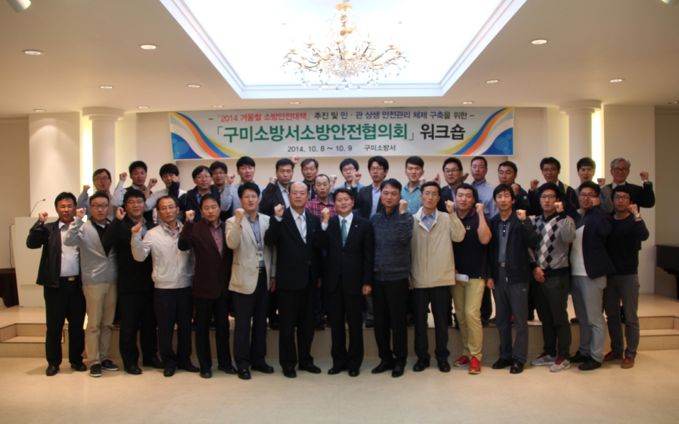구미소방서(서장 이태형)는 10월 8일 ~ 9일 양일간 직지파크관광호텔(김천시 대항면)에서 2014년 겨울철 소방안전대책 추진 및 민ㆍ관 소방안전관리체제 구축을 통한 선제적 예방과 대응을 위해 안전으로부터 국민을 행복하게 하는데 앞장서는 다짐의 구미소방서 소방안전협의회 워크숍을 개최했다.