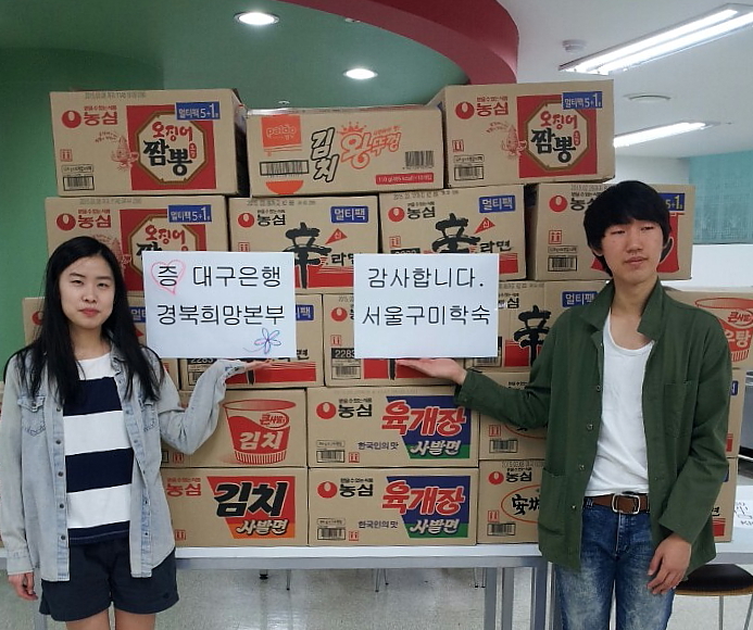 대구은행 경북희망본부(본부장 김경환)는 10월 23일 서울'구미학숙' 입사생들을 위한 간식용 라면 30박스(50만원 상당)를 전달하고 평소 학업정진에 힘쓰는 입사생들을 격려했다.