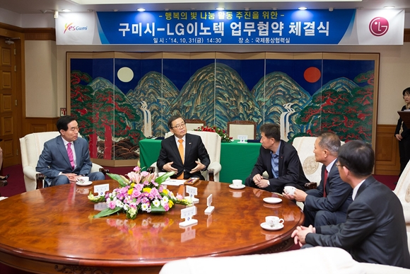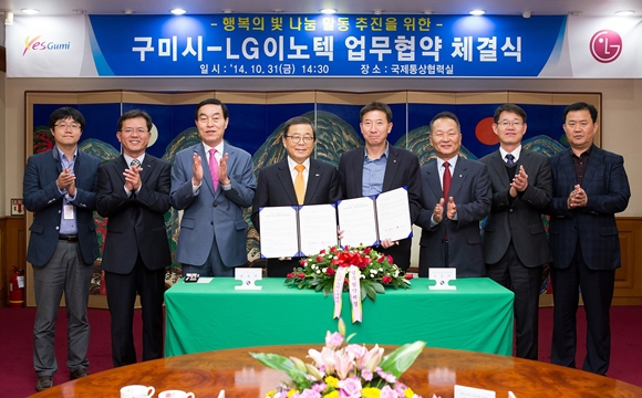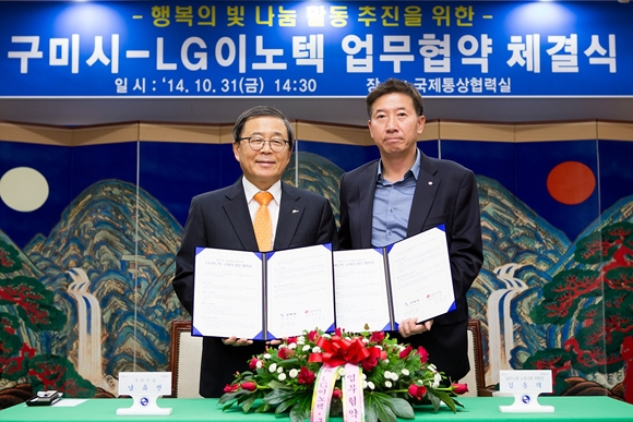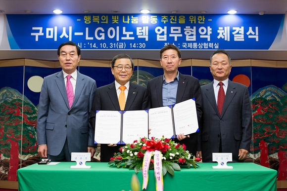 구미시(시장 남유진)는 10월 31일 구미시 통상협력실에서 남유진 구미시장과 LG이노텍 여상삼 상무, 김동의 노조위원장이 참석한 가운데 지역사회 취약계층 가정에 친환경 LED조명을 무상으로 제공하는'행복의 빛나눔 활동' 추진을 위한 업무협약을 체결했다.