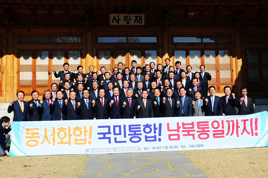 영ㆍ호남 의원들의 모임인 동서화합포럼이 11월 4일 국회 사랑재에서 전남ㆍ경북 현안간담회를 열고 내년도 예산안과 관련한 두 지역의 현안을 점검했다. 지난해 전남ㆍ경북지역 국회의원 26명이 지역갈등을 종식하고 화해와 협력을 도모하는 취지로 만든 동서화합포럼은 지난 1월 김대중 대통령 생가를 방문하고 3월에는 답방으로 박정희 대통령 생가를 방문하는 등 동서화합의 물꼬를 터 왔다. 국회의원 26명을 비롯해 최경환 경제부총리 겸 기획재정부 장관, 경북ㆍ전남도지사, 도의회의장, 시장ㆍ군수 등 70여명이 참석한 이날 포럼에서 경상북도 주요현안사업 7건, 23개 시군 현안사업 각 1건씩 보고 및 건의됐다. 구미시 관련 사업은 글로벌 통신사업자를 대상으로 국내 최초 해외통신사업자 인증랩을 구축하는 해외통신망 인증랩 구축사업(420억 원), 대구ㆍ경북ㆍ광주 등 3개 시도가 3D융합사업의 기술개발, 부품소재, 기기생산 등 연계사업으로 추진하는 초광역 연계 3D융합산업 육성사업(3,266억 원), 박정희대통령 유품전시관 건립(150억 원) 등 총 3건이다. 포럼에 참석한 남유진 구미시장은 경북시장군수협의회장 자격으로 인사말을 통해 박정희대통령 유품전시관 건립의 당위성에 대해 피력하고 참석 국회의원 전원의 동의를 간곡히 호소했다.