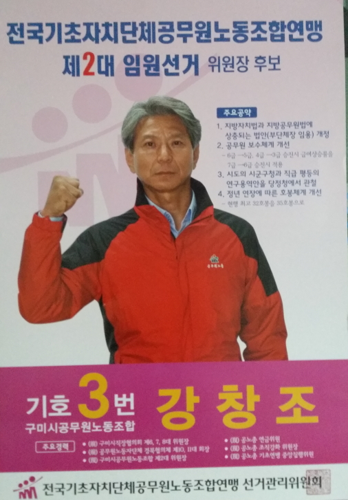 강창조 구미시공무원노동조합 위원장이 11월 10일 전국기초자치단체 공무원노동조합연맹 제2대 임원선거에서 위원장으로 당선됐다.