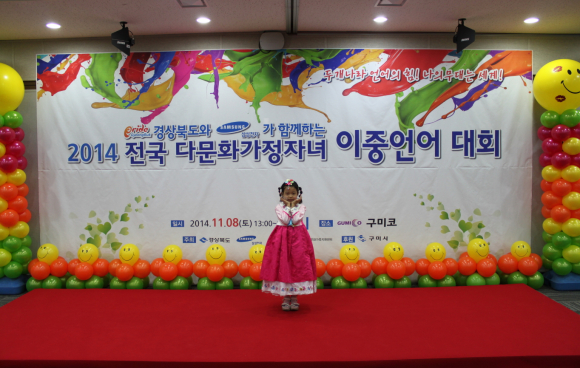 구미시(시장 남유진)는 11월 8일 구미코에서 주낙영 경상북도 행정부지사와 전우헌 삼성전자 구미공장장이 참석한 가운데 다문화가정 자녀의 부모나라 문화에 대한 이해를 돕고 외국어 구사능력 증진을 위해 '2014 전국 다문화가정 이중언어 대회'를 열었다.