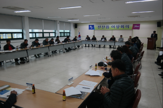 선산읍(읍장 전영욱)은 11월 24일 읍사무소 2층 대회의실에서 시의원, 지역기관단체장 및 27개리 이장 등 40여명이 모인 가운데 11월 이장회의를 개최했다.