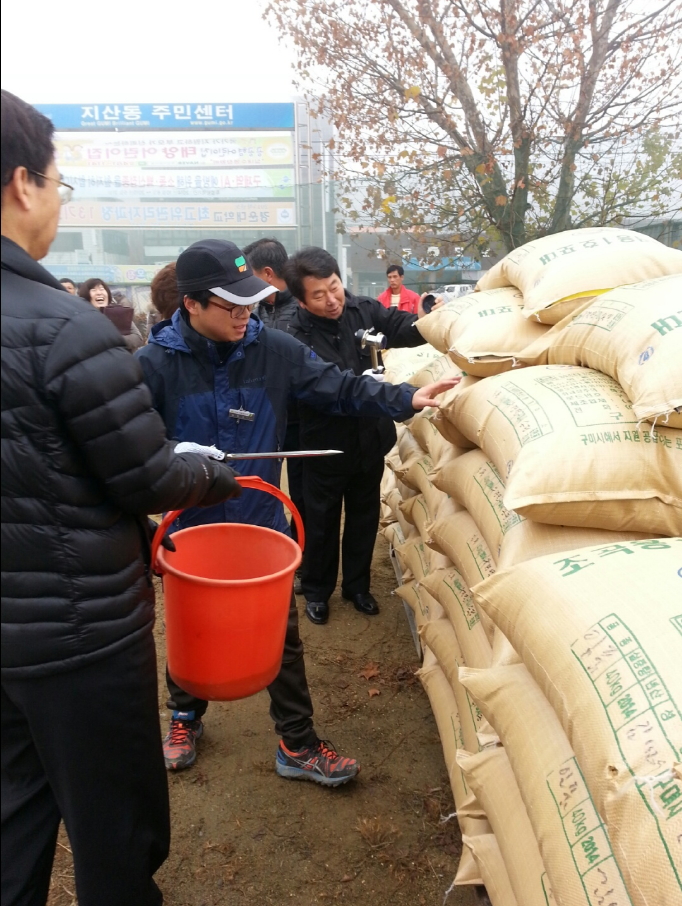 송정동(동장 류시건)은 11월 27일 지산창고에서 정하영 시의원, 김종광 구미농협조합장, 지역농민, 농산물품질관리원 검사관 등 30여명이 참석한 가운데 2014년산 공공비축미곡 매입을 실시했다.