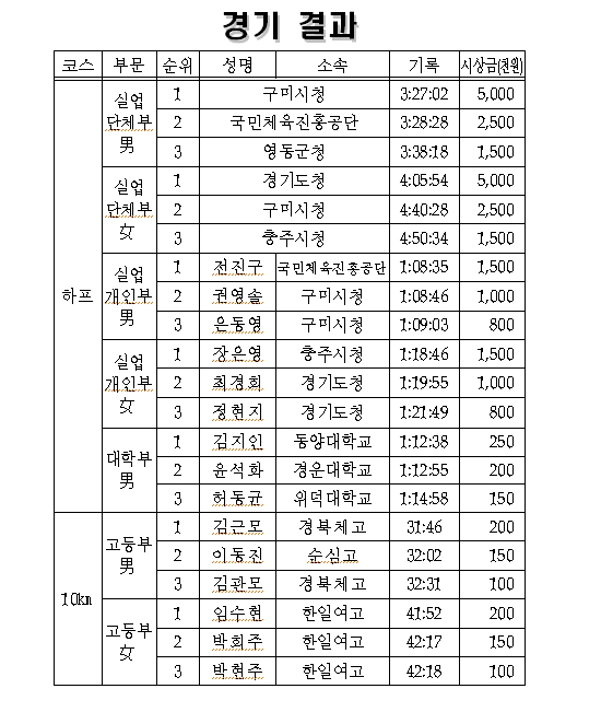 한편, 대회결과 하프 단체전 남자부에서 구미시청팀, 여자부 경기도청팀이 우승을 차지했으며, 하프 개인전에서는 실업남자부 국민체육진흥공단 전진구 선수, 실업여자부 충주시청 장은영 선수, 대학남자부 동양대학교 김지인 선수 등이 대회 우승의 영광을 안았으며, 구미시청의 권순영 감독과 경기도청의 이흥식 감독이 지도자상을 수상했다.