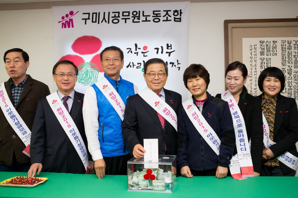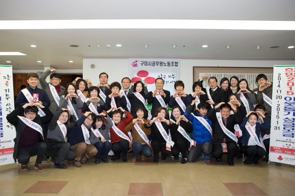 특히, 구미시(시장 남유진)와 구미시공무원노동조합(위원장 강창조)은 12월 2일 4층 강당에서 12월 직원정례조회에 앞서 개최한 사랑의 열매달기행사를 시작으로 본격적인 희망2015 나눔캠페인 활동에 나섰다. 이날 사랑의열매달기 행사는 조회에 참석한 300여 직원들의 자발적인 참여와 나눔활동으로 성금을 모았으며, 이 성금은 경북공동모금회에 이웃돕기 성금으로 기탁된다.