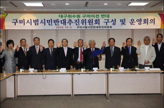 구미지역 시민단체로 구성된 구미시범시민반대추진위원회(상임위원장 신광도ㆍ김재영)는 대구 취수원의 경북 구미 이전 움직임과 관련해 12월 8일 성명서를 발표, 당위성 없는 대구취수원의 구미 이전은 절대 안 된다고 밝혔다.
