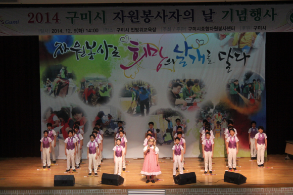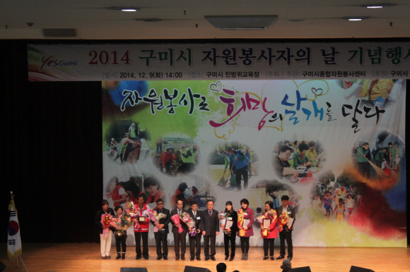 구미시(시장 남유진)와 구미시종합자원봉사센터(소장 김봉재)는 자원봉사자들의 노고를 격려하고 봉사활동 자긍심 고취를 위해 12월 9일 자원봉사자, 복지기관 관계자 등 400여명이 참석한 가운데 2014 구미시 자원봉사자의 날 기념행사를 민방위교육장에서 개최했다.