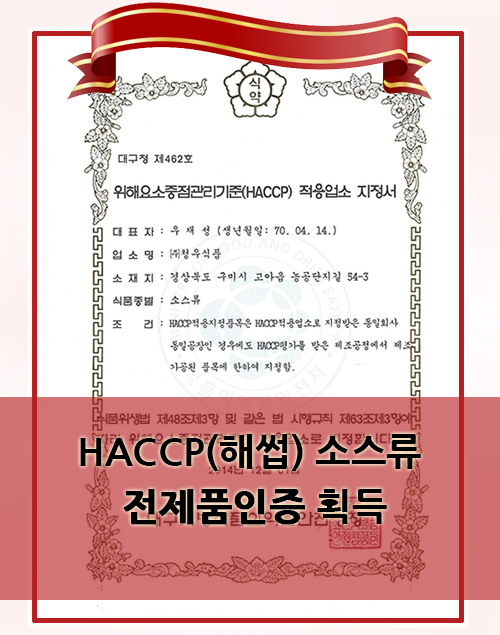 구미시에 본사를 두고 있는 ㈜청우식품(대표 우재성)은 지난 12월 1일 식품의약품안전처로 부터 해썹(HACCP: Hazard Analysis Critical Control Point, 위해요소중점관리기준) 인증을 획득했다.