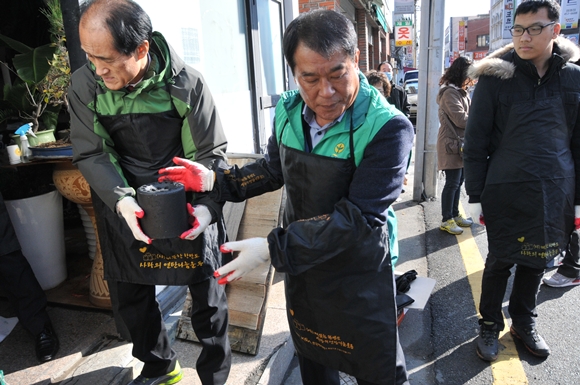 윤창욱 경상북도의회 부의장과 경상북도개발공사, 구미시 원평1동 주민센터 직원들이 12월 16일 어려운 이웃의 따뜻한 겨울나기를 위해 연탄 나르기 봉사에 나서 귀감이 되고있다.
