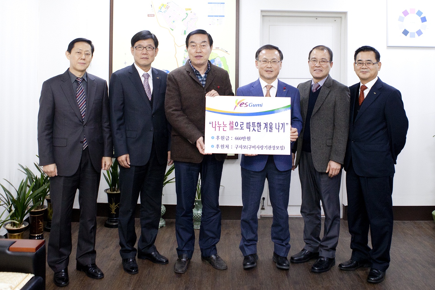 구미사랑기관단장모임(이하 구사모, 회장 최종원 구미시부시장)은 12월 16일 구미시를 방문해 사회복지시설 및 저소득 위기가구 지원을 위한 성금 660만원을 전달했다. 이날 구사모 기관장들은 금오종합사회복지관과, 성심요양원, 셀린의 집(성심양로원) 등 시설을 방문해 운영에 필요한 물품을 구입 하도록 각1,000천원의 성금 전달에 이어 시설견학과 시설장, 직원들로 부터 시설운영 애로 사항을 청취했다.