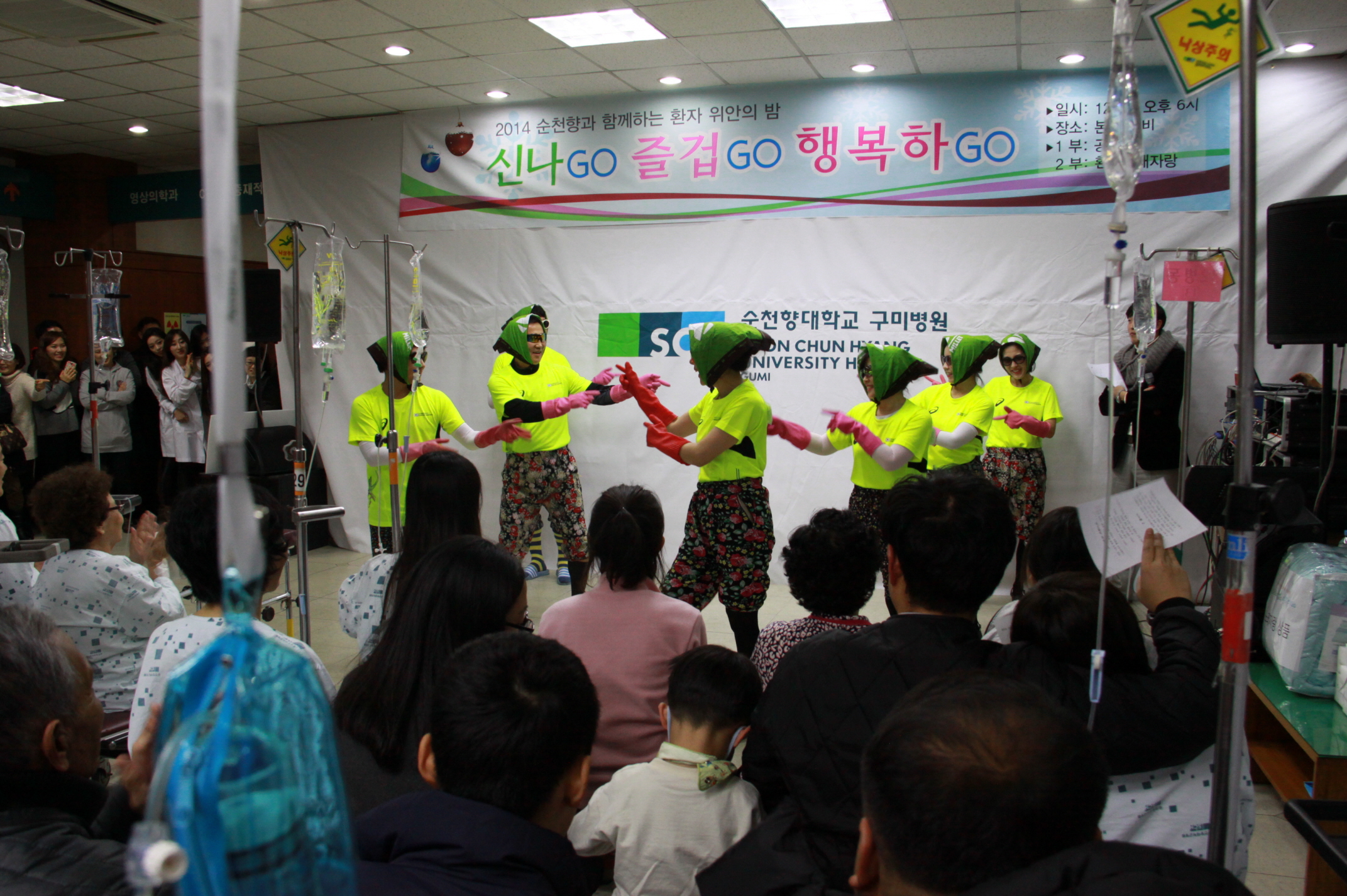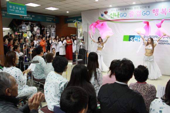 이날 행사는 '신나GO 즐겁GO 행복하GO'라는 주제로 순천향병원 의사, 간호사들로 구성된 9개팀이 한달 간의 준비기간을 거쳐 플룻4중주, 성악, 기타연주, 아이돌댄스, 밸리댄스 등 다양한 재능을 선보이며 환자들에게 감동과 재미를 선사했다.