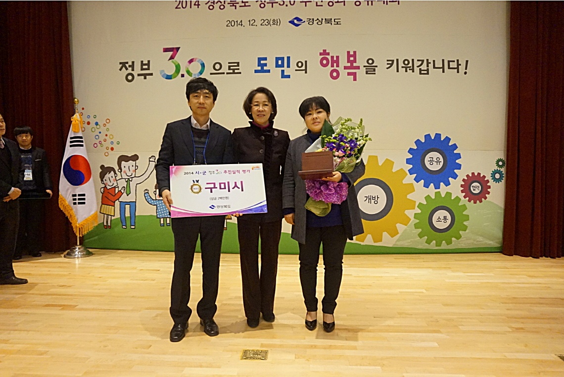 경상북도가 주관하는 '2014 정부 3.0 시군 추진실적 평가'에서 구미시가 '최우수상'을 수상하는 쾌거를 이뤘다.