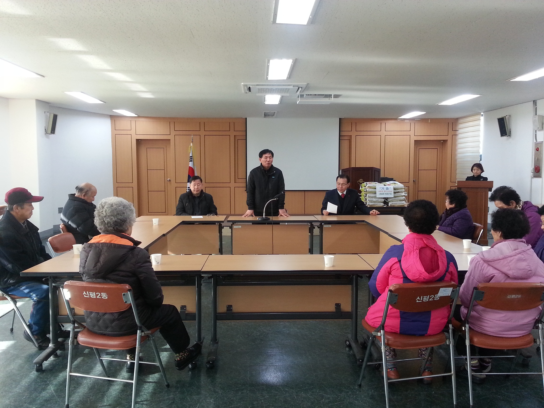 신평2동(동장 이영활)은 12월 26일 동주민센터에서 동장님을 비롯한 김익수 시의장님이 참석한 가운데 신평교회(목사 한상대)에서 기탁한 사랑의 쌀 100kg(10포, 35만원상당)를 저소득 독거노인과 조손가정 10세대에 전달하고 식사도 대접했다.