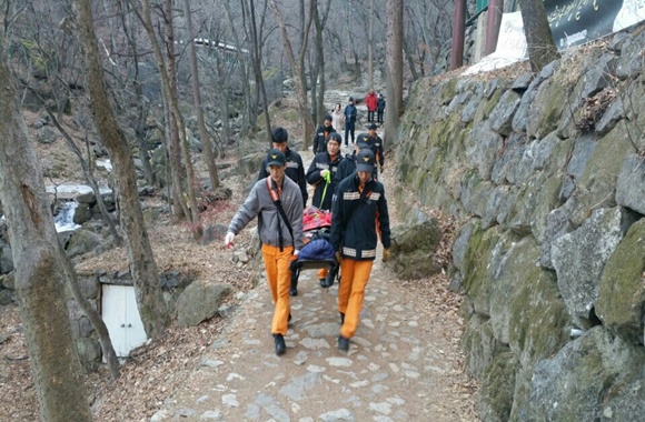 이날 구조된 김 모씨(43세,여)는 오후 1시경 금오산 폭포에서 빙판에 미끄러지면서 우측 발목 부상으로 구조를 요청해 응급처치 후, 인근병원으로 이송됐다.
