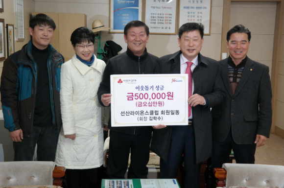 선산지역의 대표적인 청년 봉사단체 중 한 곳인 선산라이온스클럽(회장 김학수) 회원들이 1월 9일 선산읍사무소(읍장 전영욱)를 방문해 이웃돕기 성금 50만원을 기탁했다.