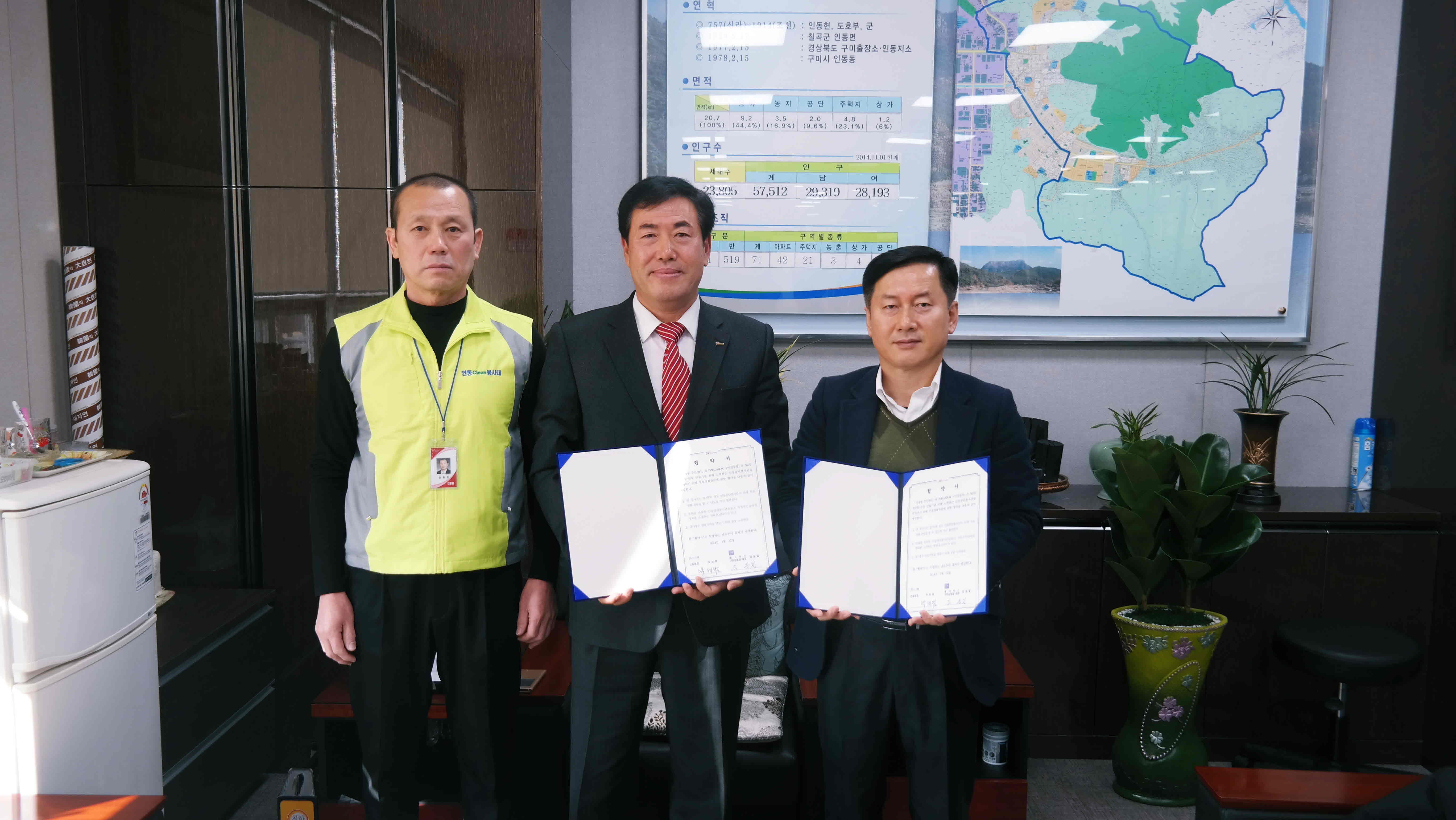 인동동(동장 박세범)은 1월 12일 주민센터에서 MEGABOX 구미강동점(대표 김동일), 인동클린봉사단(단장 장한진)과 함께 365일 깨끗한 인동만들기를 위한 인동 클린봉사단 무료영화관람 업무협약을 체결했다. 인동클린봉사단은 2014년 12월 11일 발대식을 갖고 4명이 한조를 이루어 총 15개조가 토ㆍ일요일 등 공휴일에 원룸 밀집지역, 인동 도시숲주변, 도심외곽지역 등 환경관리 취약지에 대한 지속적인 홍보계도, 단속활동을 펼쳐왔다.