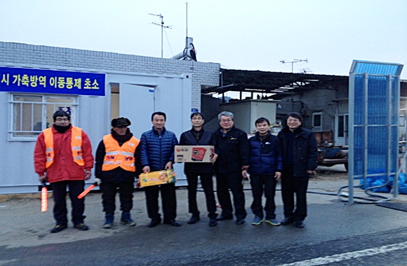 전국한우협회 구미시지부(지부장 정강식)는 관내 구제역 확산방지와 차단방역에 총력을 기울이고 있는 도개면 이동통제 초소를 방문해 컵라면 10박스와 감귤 10박스 등 구제역 방역 지원물품을 전달했다.