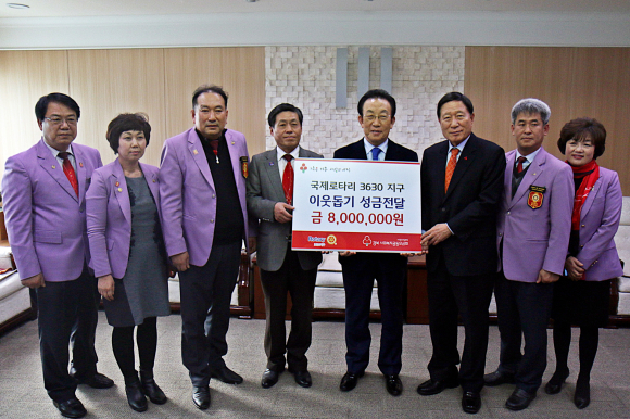 국제로타리 3630지구(총재 문상현)는 1월 15일 경북도지사 접견실에서 김관용 도지사, 문상현 국제로타리 3630지구 총재, 신현수 경북사회복지공동모금회장 등 관계자들이 참석한 가운데 희망 2015 나눔캠페인 이웃돕기 성금 800만원을 경북사회복지공동모금회(회장 신현수)에 기부했다.