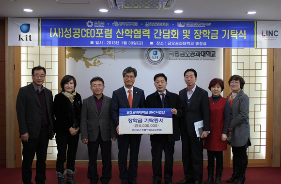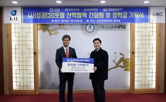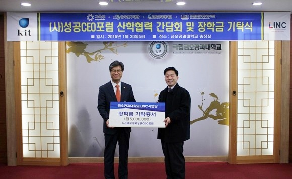 특히, 이날 간담회에 이어 (사)대구경북성공CEO포럼 최희식 회장이 장학금 5백만 원을 기탁하며, "금오공대가 지역기업과 동반 성장하는 대학으로 거듭나길 바라며, 우수 인재 양성에 힘 써주길 바란다"고 전했다.