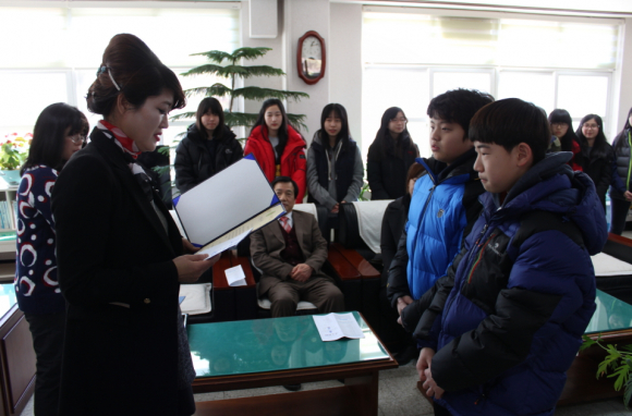 국민행복나눔봉사단(회장 김춘희)이 2월 12일 도량동 야은초등학교 교장실에서 권영채 교장, 윤문이 국민행복나눔봉사단 사무국장, 학부모 및 학생들이 참여한 가운데 장학금 전달식을 가졌다.