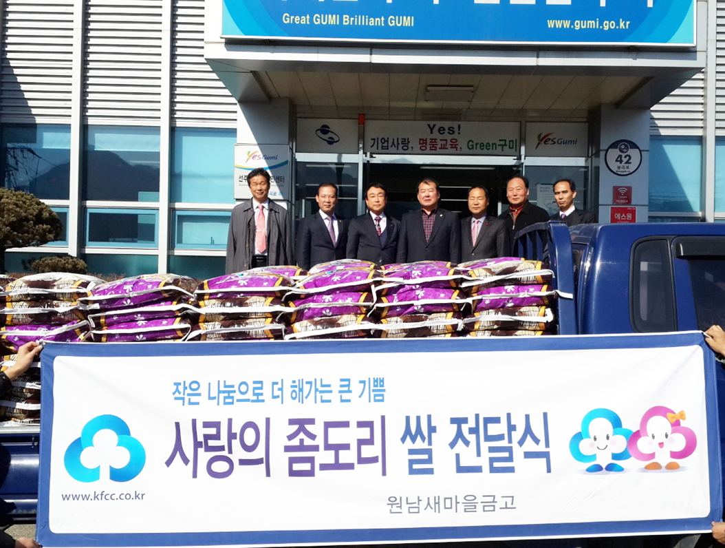 원남새마을금고(이사장 노자우)는 2월 13일 사랑의 좀도리 운동을 통해 마련된 쌀 20kg 200포를 기탁하는 '사랑의 좀도리 전달식'을 가졌다.